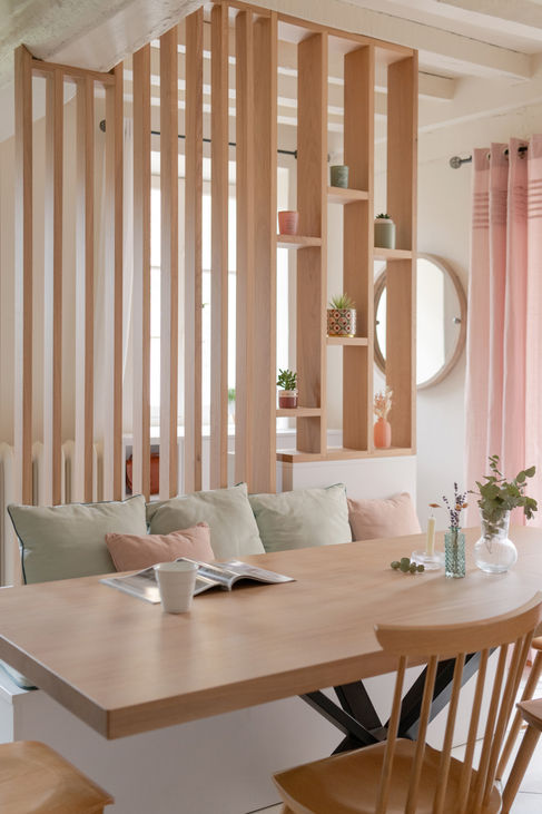 Ces pièces remplies d'histoires avec leurs murs tordus, leurs poutres, leurs cheminées, leurs pierres (...) avaient besoin d'être sublimées. Il a fallu faire un gros travail d'optimisation des espaces et d'aménagement de meubles sur mesure afin de mettre en lumière cette magnifique maison tout en respectant l'héritage du lieu dans une atmosphère délicate et végétale.